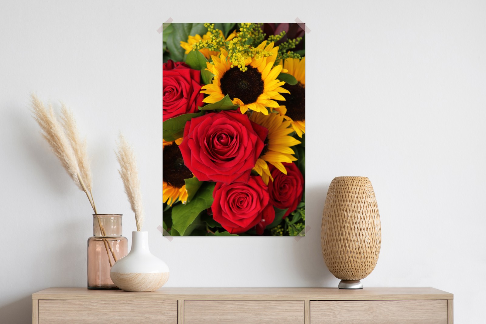 Plakat Czerwone róże i słoneczniki w bukiecie
