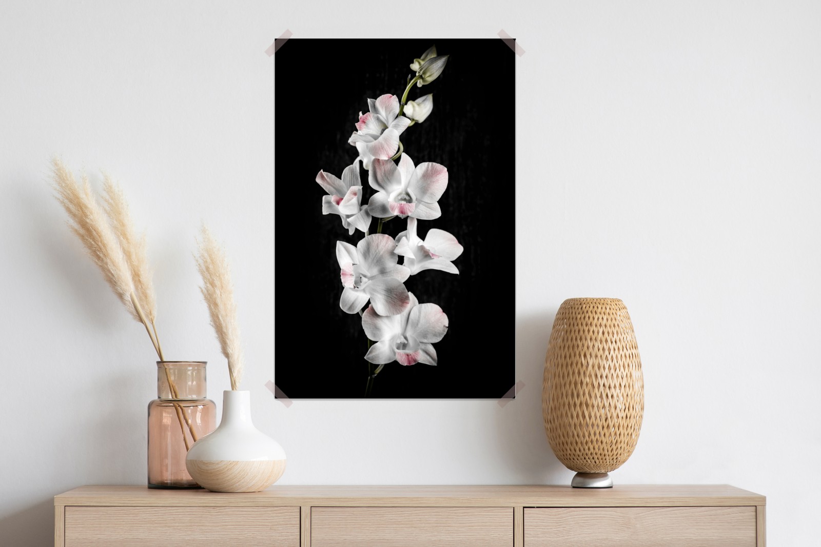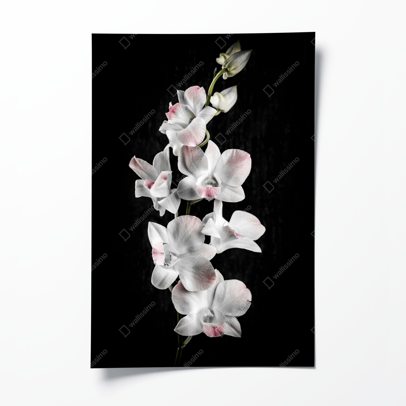 Dodaj elegancji wnętrzu dzięki zbliżeniu białych i różowych storczyków na głębokim czarnym tle, idealne do nowoczesnych aranżacji.