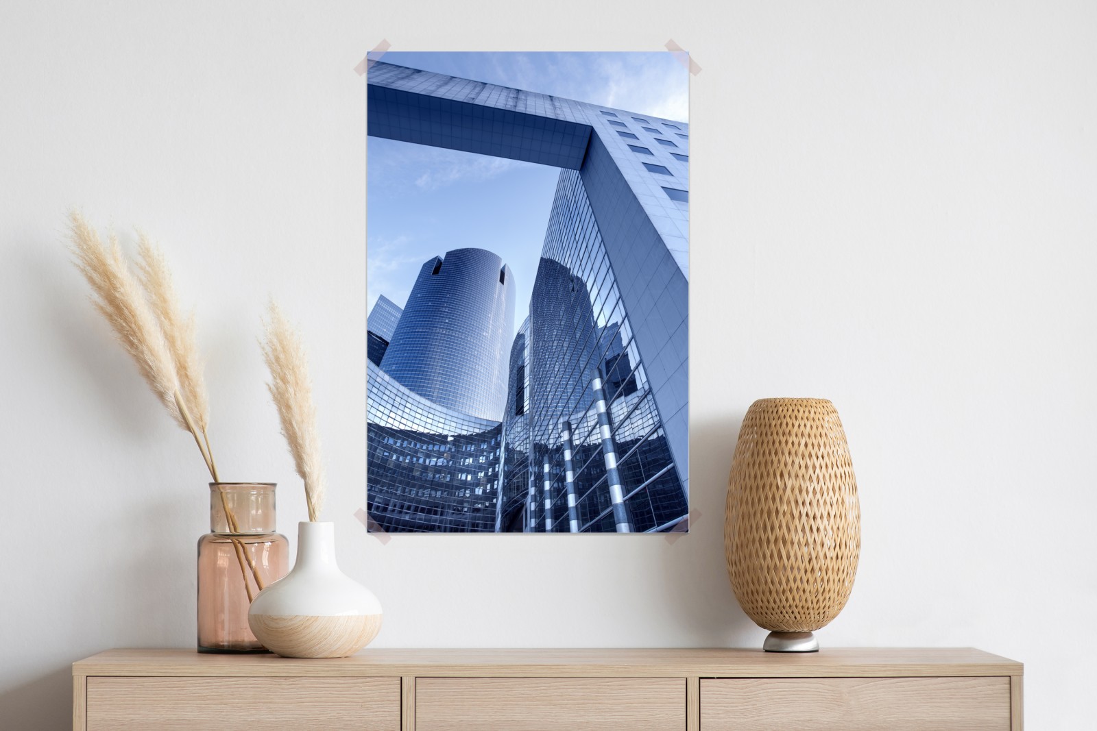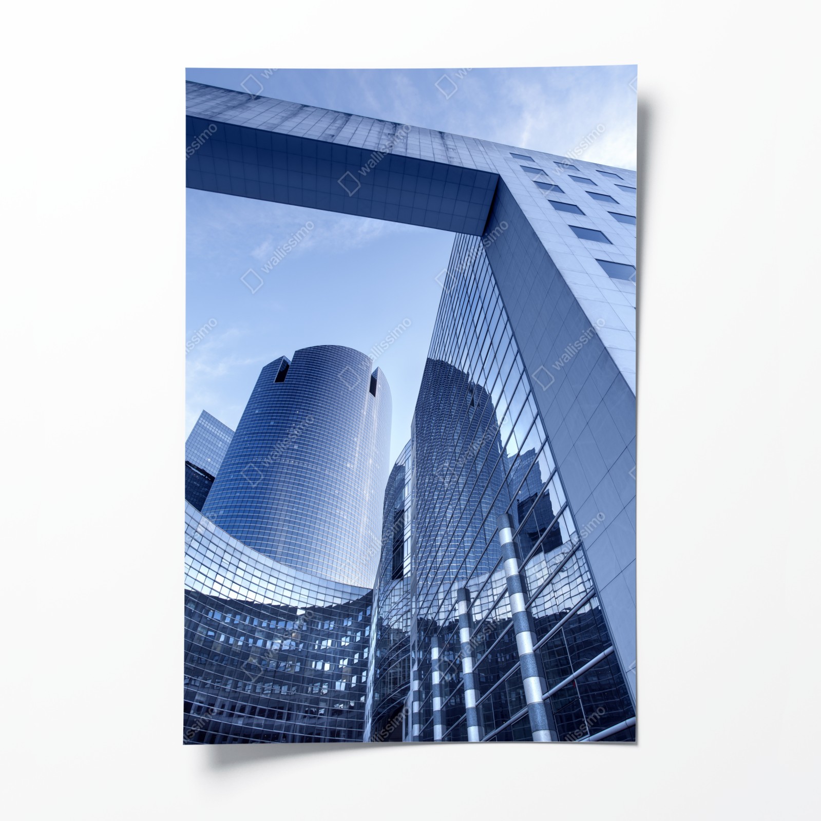 Odkryj uderzającą geometrię nowoczesnych wieżowców utrwalonych w chłodnych niebieskich tonach. Idealny do współczesnych wnętrz szukających architektonicznej elegancji.