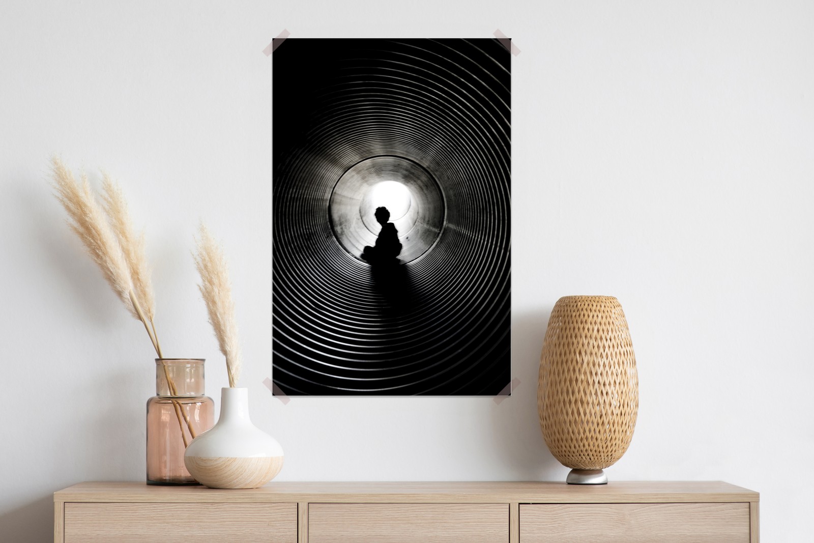 Efektowna monochromatyczna sylwetka w spiralnym tunelu wprowadza minimalistyczny dramat i nowoczesną głębię do każdego wnętrza.