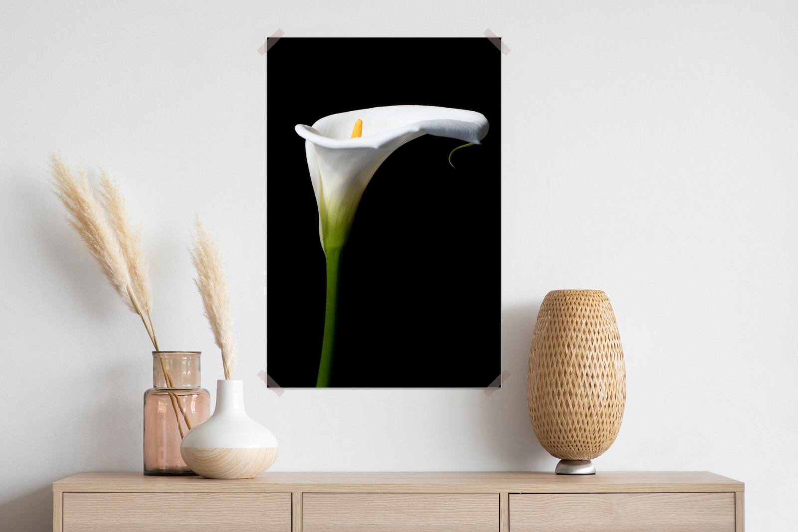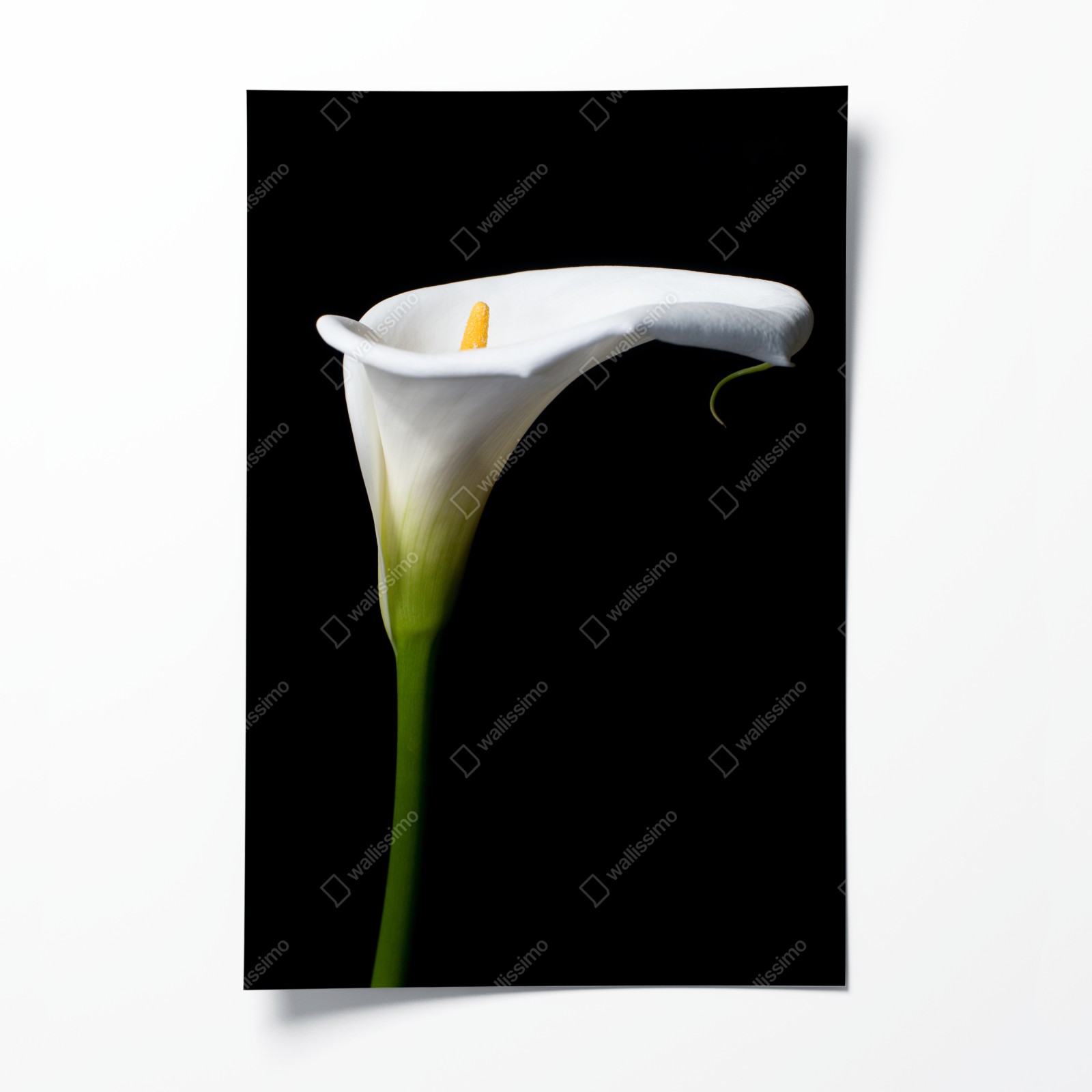 Dodaj elegancji i spokoju do wnętrza dzięki temu minimalistycznemu obrazowi białej kalii na kontrastowym czarnym tle.