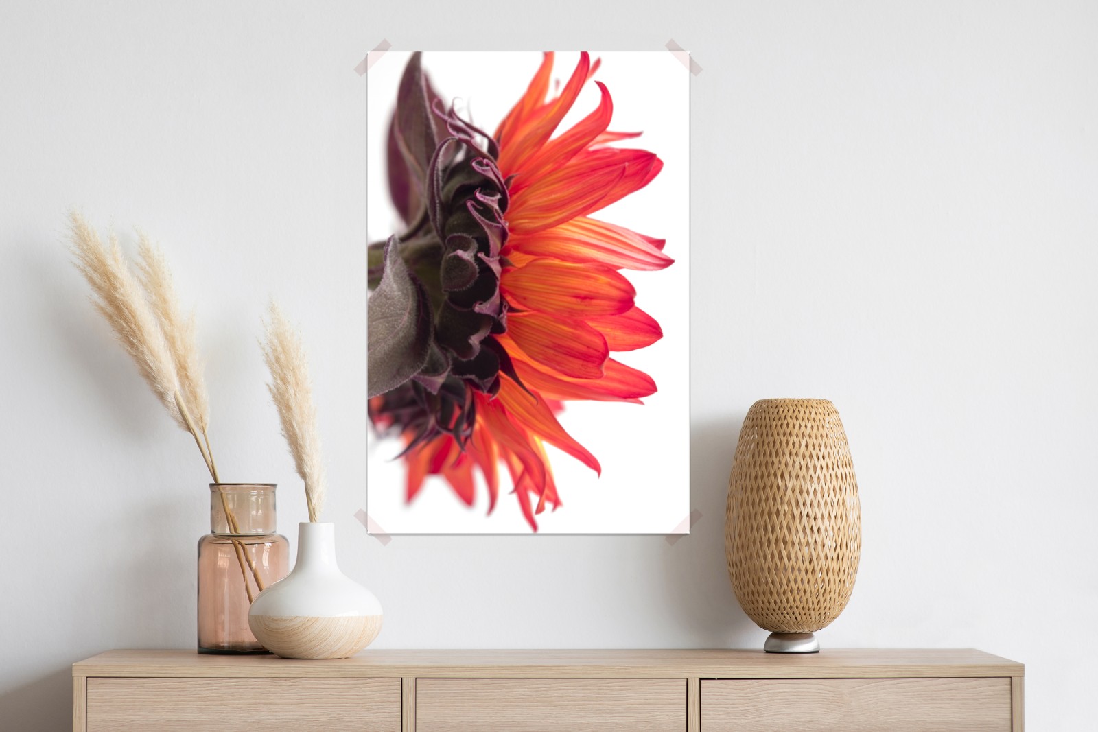 Wprowadź intensywną, naturalną energię do wnętrza dzięki zbliżeniu pomarańczowego słonecznika, idealnemu do dodania koloru i ciepła każdemu pomieszczeniu.