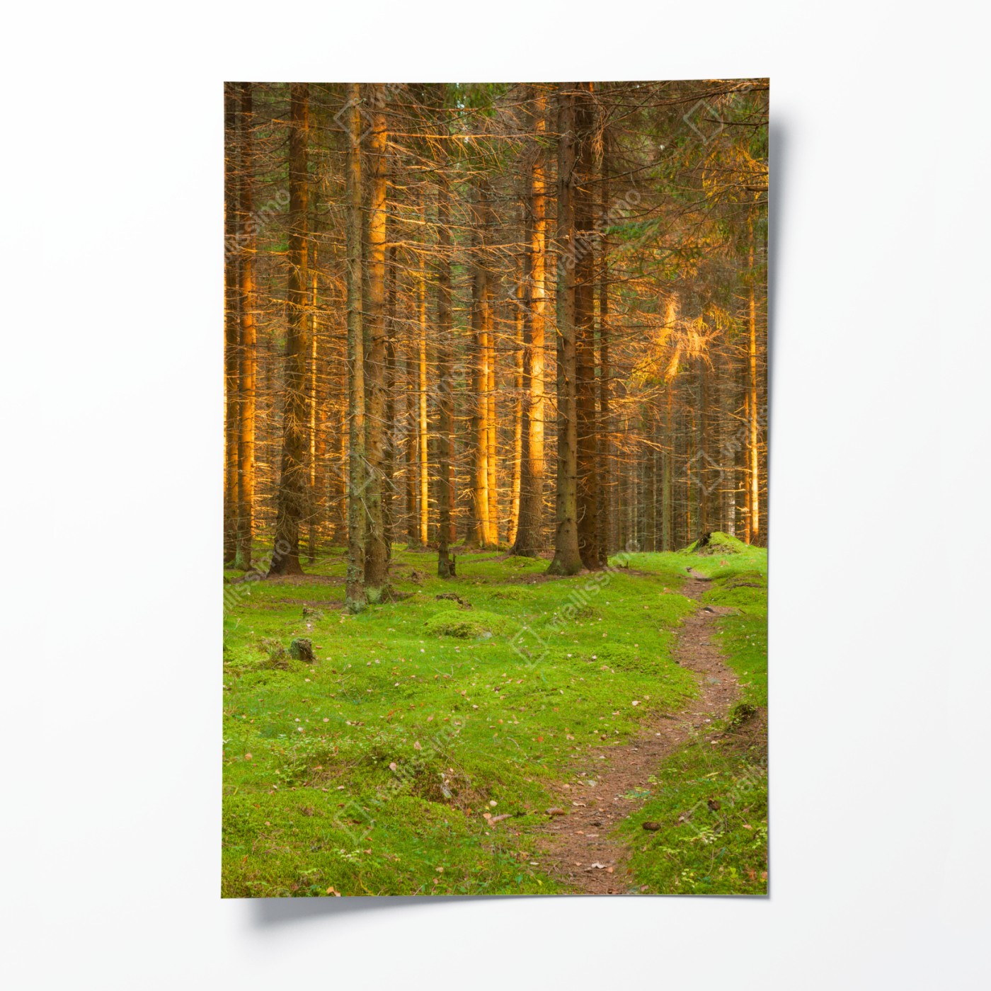 Plakat Złote światło lesie sosnowym porośniętym mchem