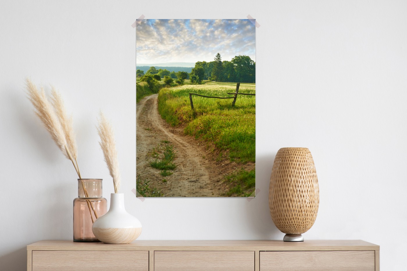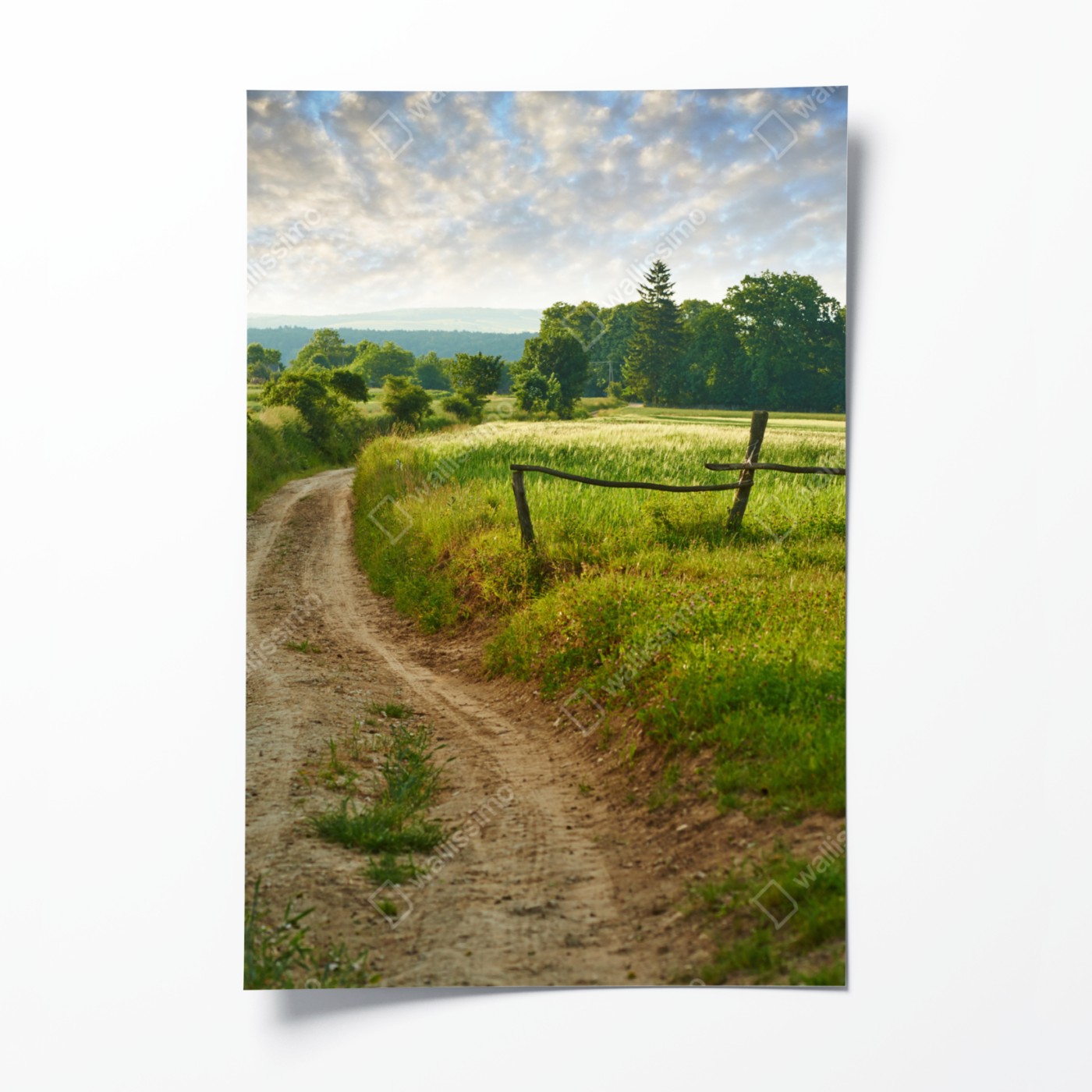 Plakat Słoneczna wiejska ścieżka przez zielone łąki